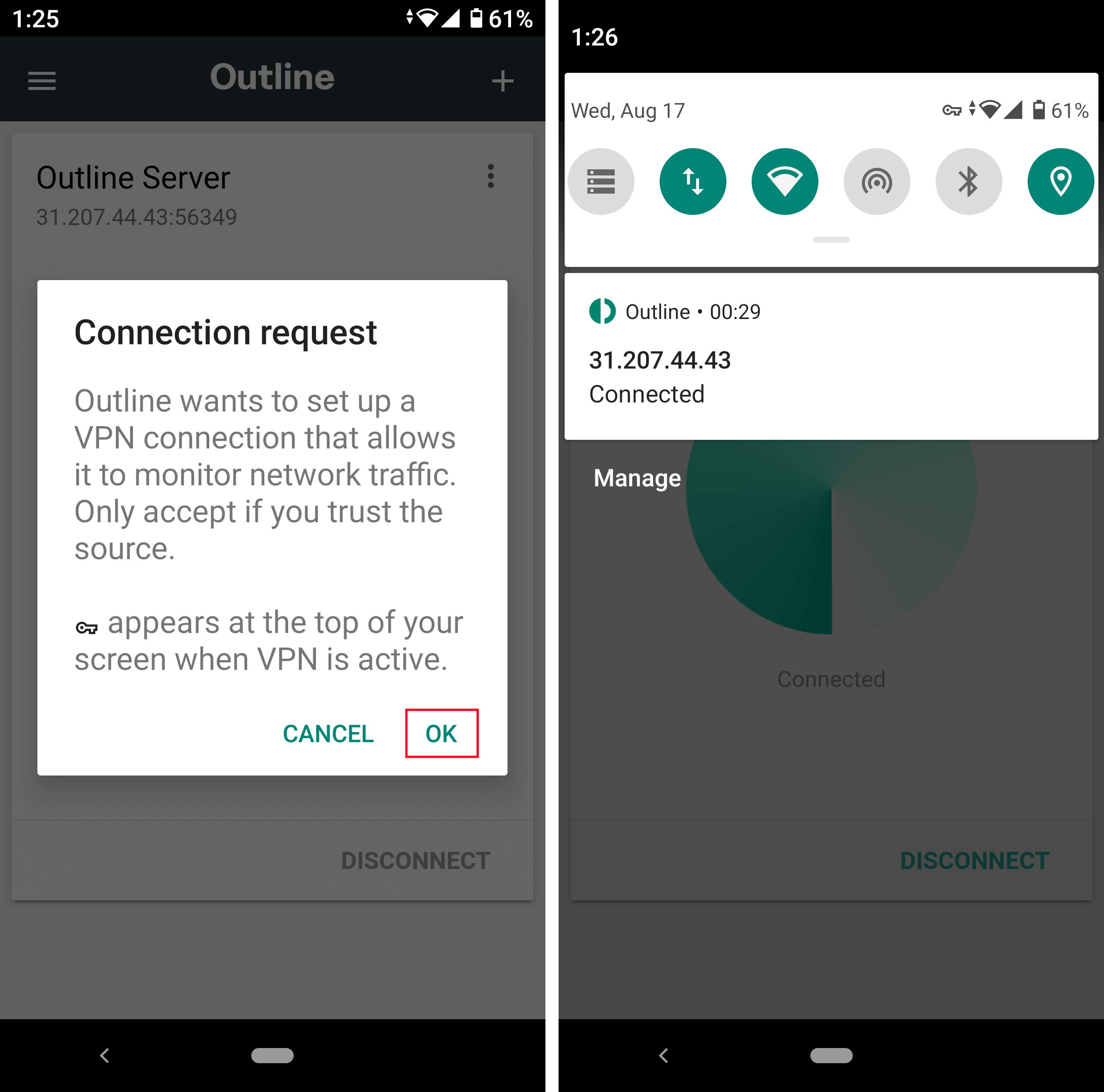 On mobile devices, the first time you connect, you must agree to add the VPN configuration by pressing the OK button: