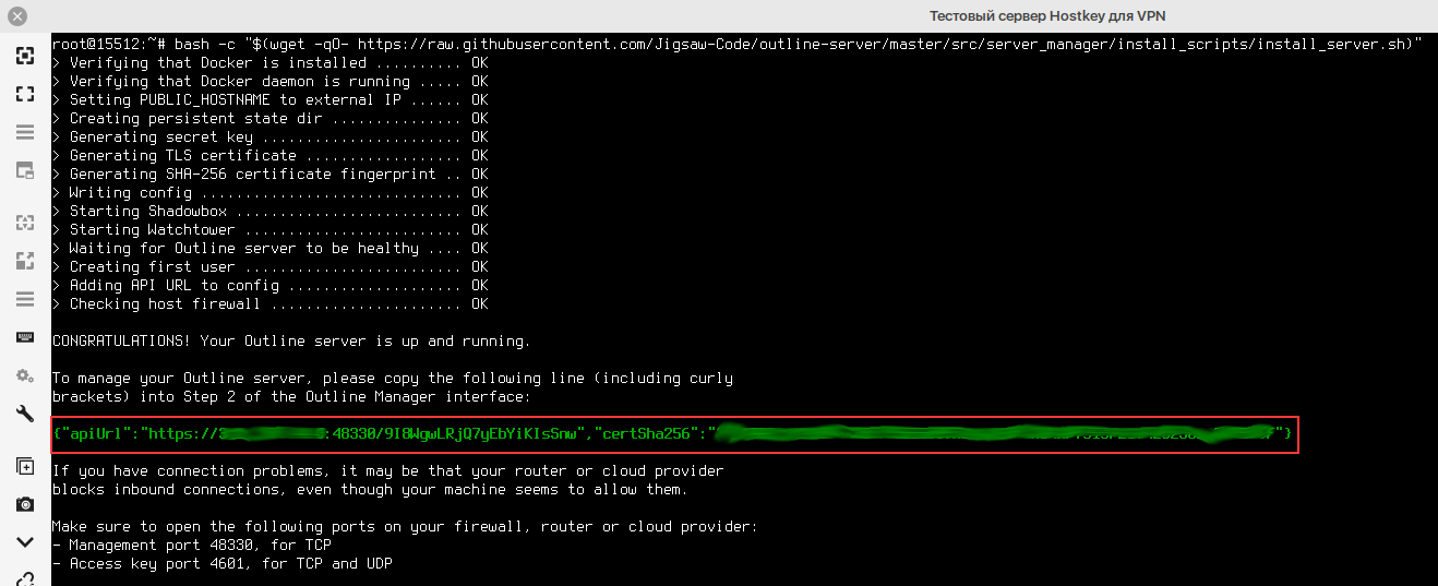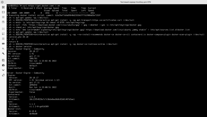 The server part of the Outline software is deployed automatically. Before starting the configuration, you need to install Docker using the following command: