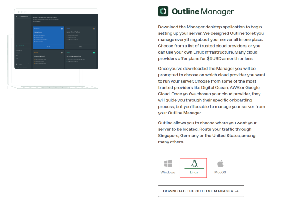You need to download it from the official website, install it on your computer and run Outline Manager for Windows, MacOS or Linux: