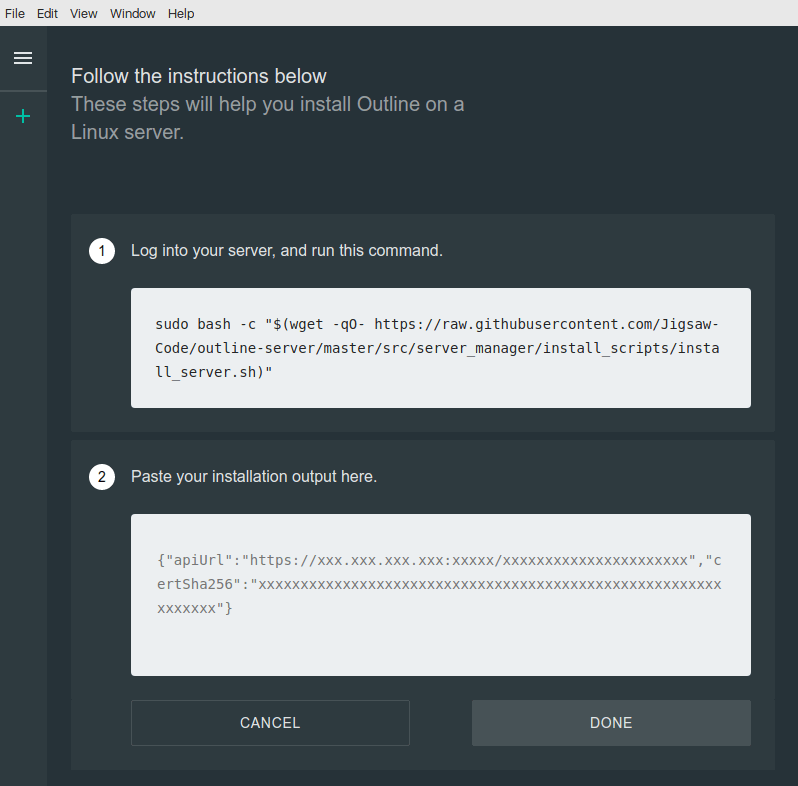 This completes the installation of the Outline VPN Server part. All that remains is to copy the line highlighted in green from the results of the installation script, paste it into the special input field of the Outline Manager application and press DONE button: