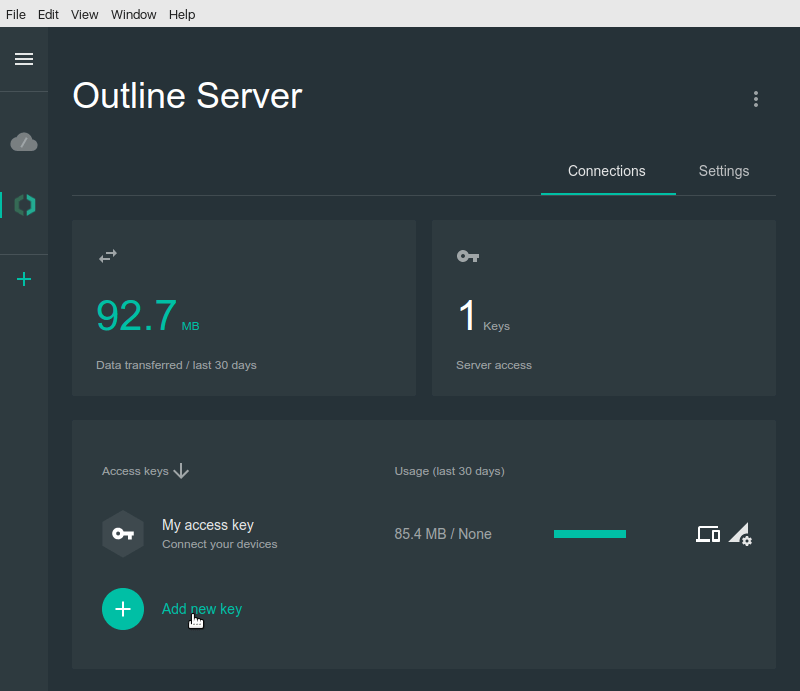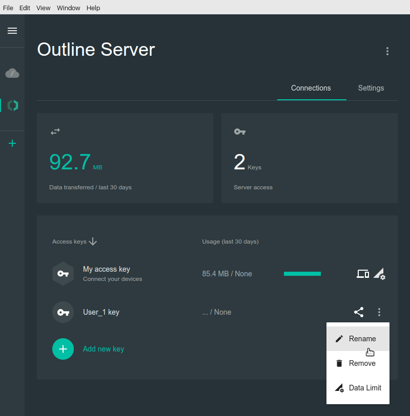 To access the Outline VPN server, users need special keys generated in Outline Manager. This key is created during the installation process, but we recommend that you only use it for administration purposes. To add a new key, click on the appropriate button and rename it: