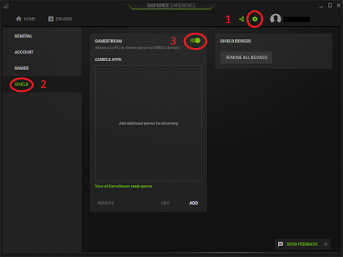 (Gear) button. Then choose the SHIELD, option. Make sure the GameStream switch is in the On position (green).