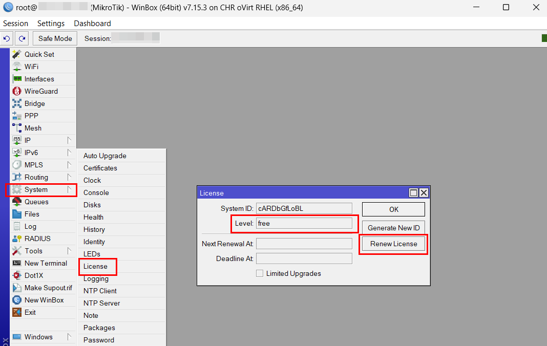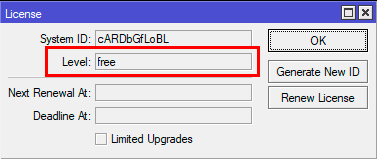 When using Winbox to view the license level, go to the System >> License tab. By default, a free (free) CHR (Cloud Hosted Router) license is installed: