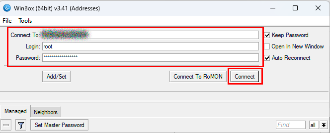 Launch Winbox, enter the server's IP address in the Connect To field. Enter your login and password into the respective fields, then click the