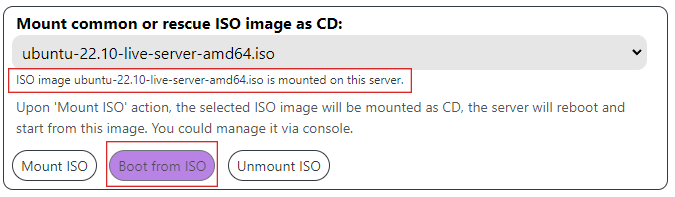 After selecting the operating system, you must press the buttons - Mount ISO and Boot from ISO: