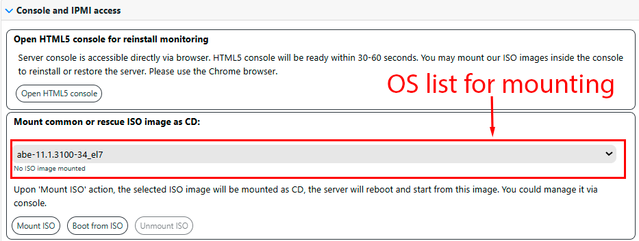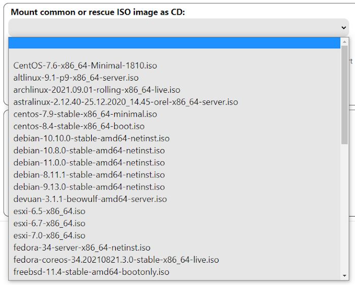 The Mount common or rescue ISO image as CD section is only available when managing virtual servers and Supermicro servers with X10 and X11 (and in some cases X9) motherboards. In this tab, it is possible to select an ISO with the required operating system from the drop-down list: