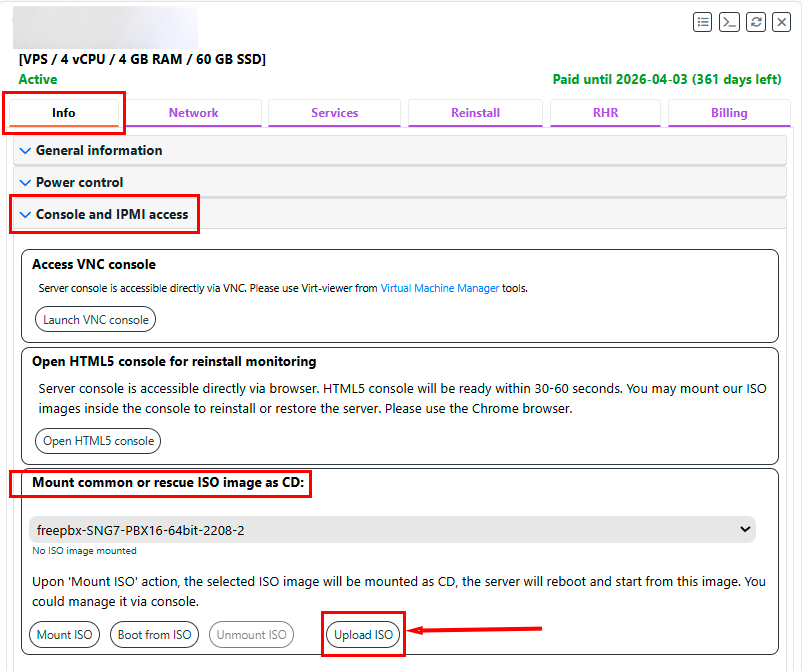 Go to the tab Info >> Console and IPMI Access >> Mount common or rescue ISO image as CD and click the