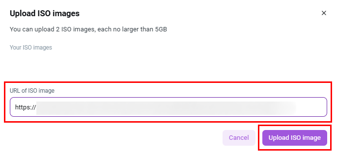 Enter the URL of your ISO image. For example, you can use official distribution repositories such as CentOS.org to download a CentOS image, or file storage services.