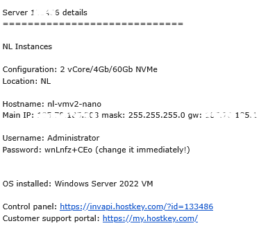 - Login and password are sent to the email specified at registration immediately after server creation.