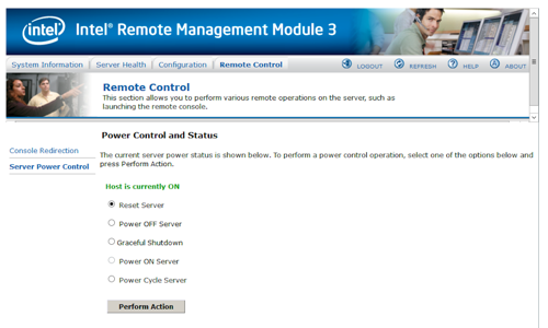 Power ON/OFF/Reset functions are available at the Server Power Control: