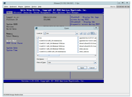 Use F2 button to access the server BIOS after reboot and Device >> Redirect ISO menu item to connect the OS image you need: