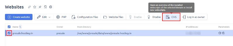 If a CMS was not selected when the site was created, it can be added later. To do so, select the desired one in the Sites menu and click CMS button: