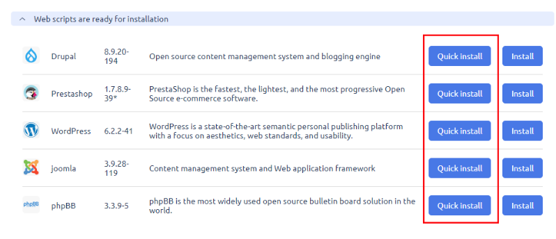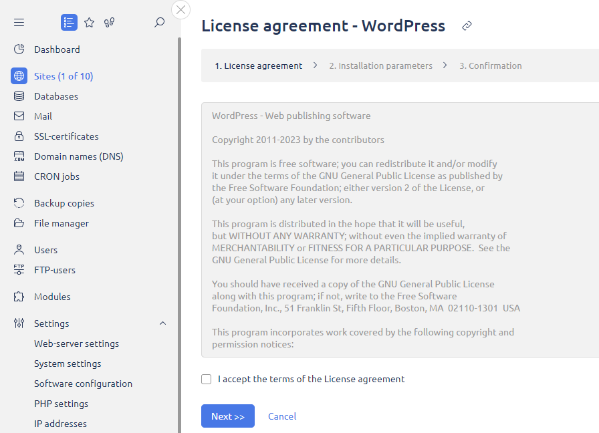 After selecting the CMS, all you need to do is click on the Quick Install button. Then, read the license agreement and accept it:
