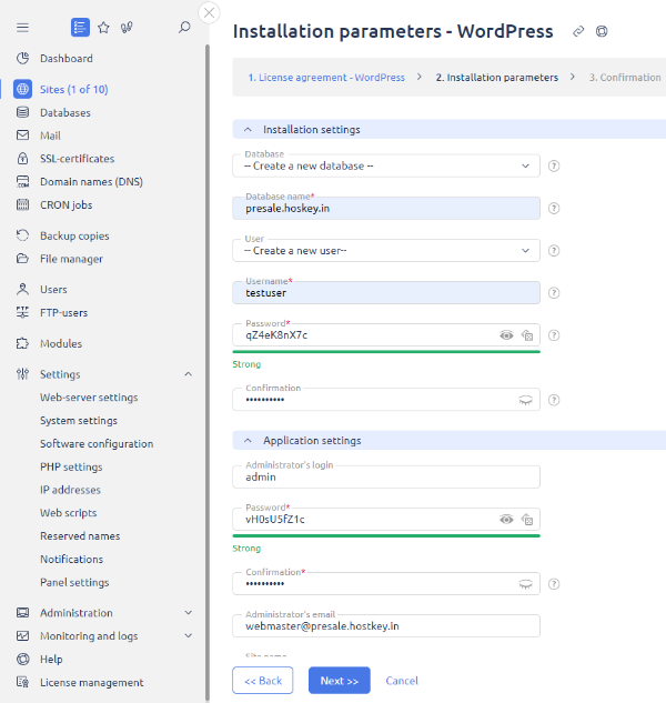 After installing the CMS, you need to specify the user who will manage it, as well as set the login and password of the administrator and specify the e-mail address: