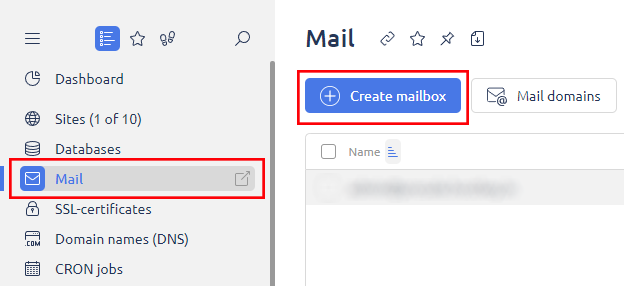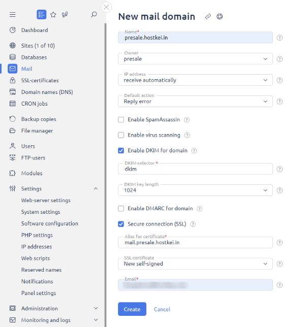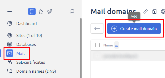 Before setting up the e-mail server, you need to create a mail domain. This is done in the Mail section - just click on the Mail Domains button and then Create mail domain: