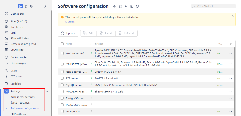 Before working with the site it is necessary to install software useful for work. You can do it by going to Settings >> Software Configuration, selecting the necessary items and clicking the Install button.