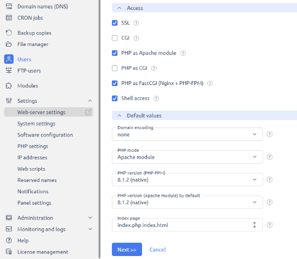 - Web server (WWW) - selection of a web server that will host users' sites. Possible options - Apache, Nginx, LiteSpeed. Required to configure performance, caching and security settings.