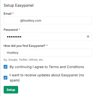 After installing EasyPanel, the first step is to create an administrator account for managing the panel and organizing access through a secure domain.