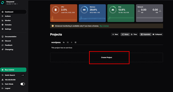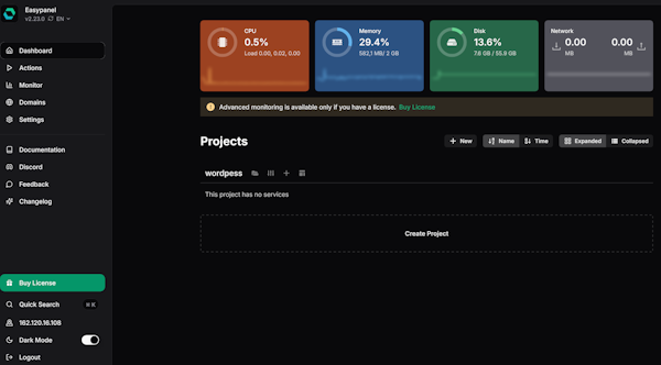 Upon logging into EasyPanel, users have access to the main Dashboard menu: