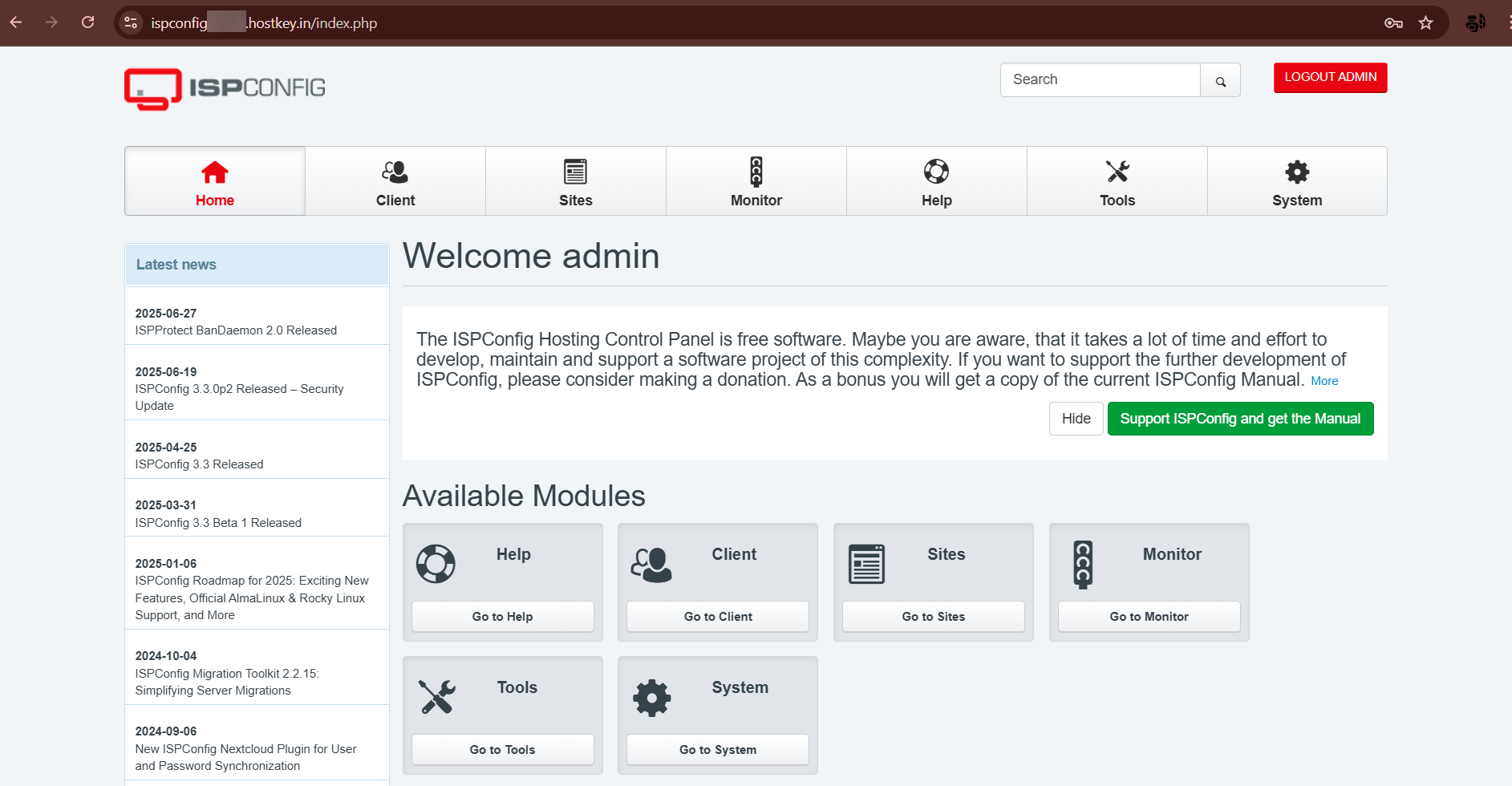 After successfully logging into the ISPConfig control panel, the start screen with a Welcome admin greeting will open, offering the following functionalities:
