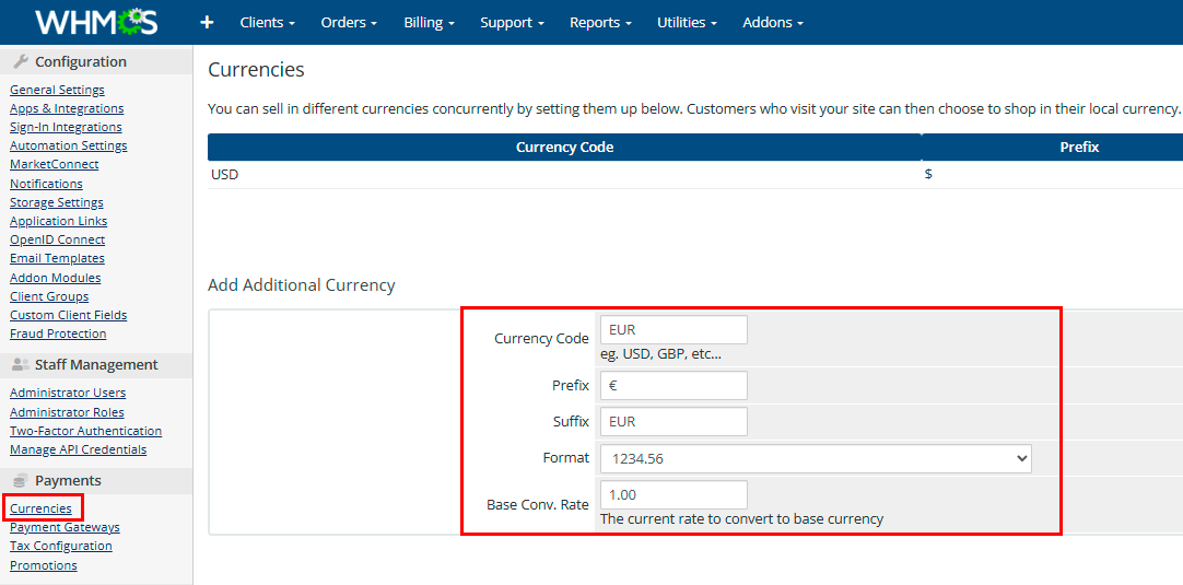 By default, the system is configured for USD. To add a new currency (for example, EUR):
