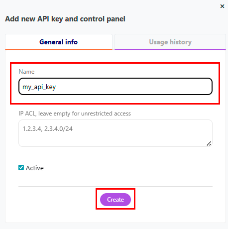 my_api_key); - In the IP ACL field, you can specify IP addresses to restrict access (leave empty for unrestricted access);
