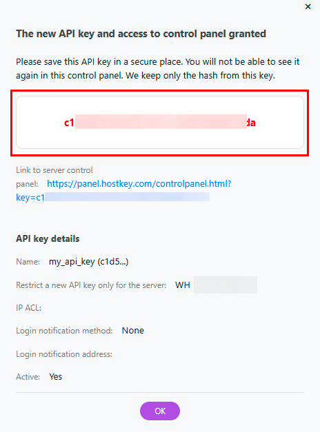 - Important! Copy and save the displayed API key in a secure place (highlighted with red background);