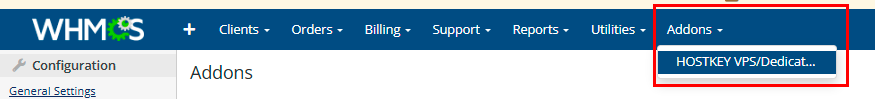 - In WHMCS, go to Addons → HOSTKEY VPS/Dedicated;