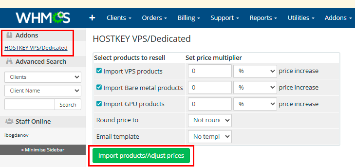 After completing the configuration, click the Import products/Adjust prices button to import products from HOSTKEY catalog into your WHMCS system.