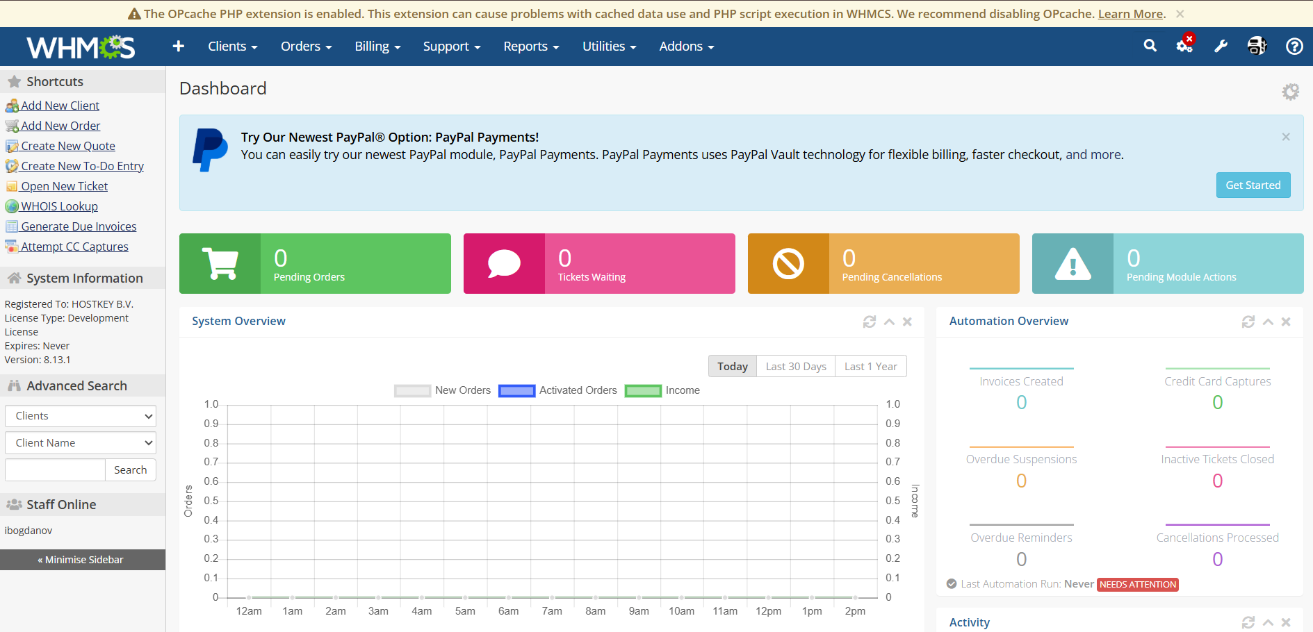 After successfully logging into the WHMCS admin panel, the main management dashboard will open: