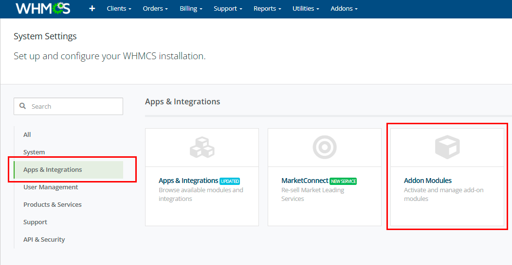 - Select Addon Modules to manage additional modules: