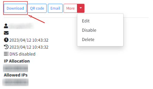 - Open the control panel of the WireGuard VPN server using the link from the Connection data section;
