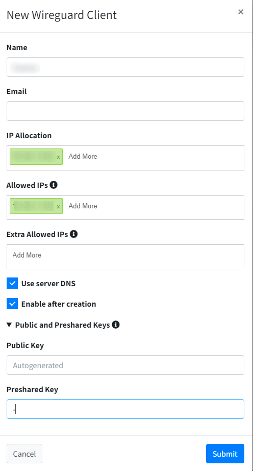 Fill in the required Name field. Do not change the rest of the fields unless necessary: - IP Allocation - is automatically filled; - Allowed IPs - is automatically filled. 0.0.0.0/0 means that access to all network resources will go through the VPN while connecting to a VPN server; - In the Preshared Key item, you can put down the "-" sign. This will disable additional encryption, which is required for resistance to hacking, but at the moment of technological development is not in demand: