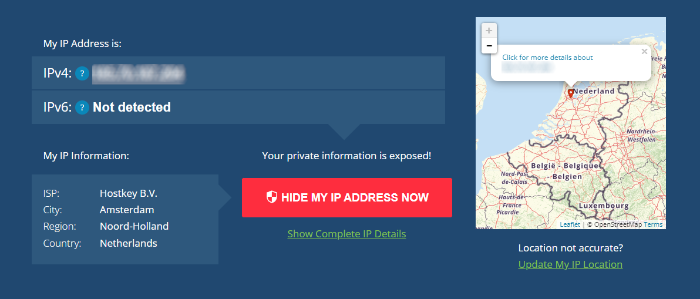 To check the connection to the server, you can enter What is my IP in your browser's search bar or visit whatismyipaddress.com. If a successful connection has been made, the IP address and region will be displayed: