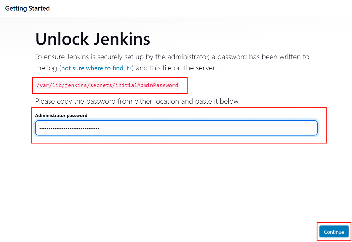 - On first launch, you'll see the Unlock Jenkins screen.