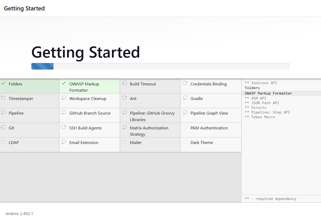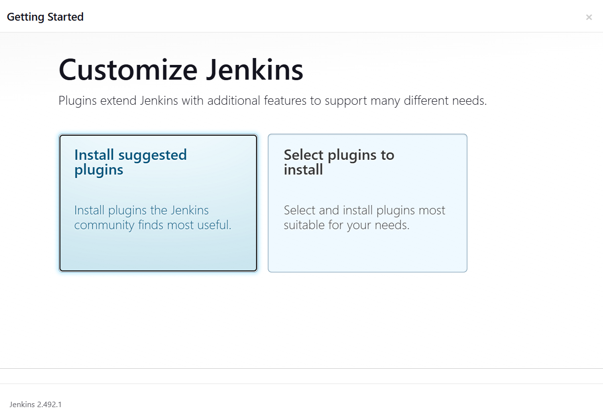 - Install suggested plugins — install recommended plugins considered most useful by the Jenkins community.