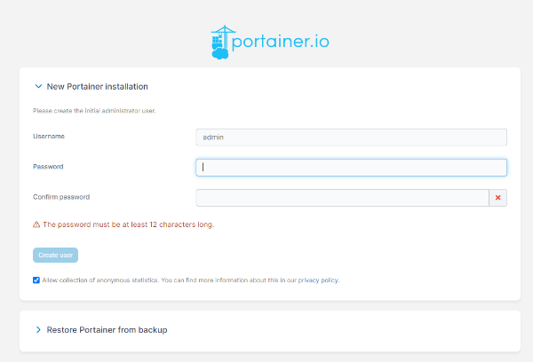 Navigate to the link and create an administrator account within 30 minutes after server deployment. Fill in the fields Username, Password, and Confirm password, then click the button: