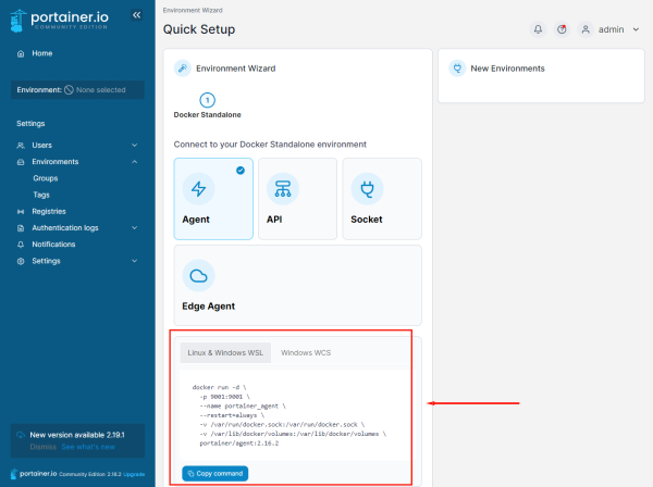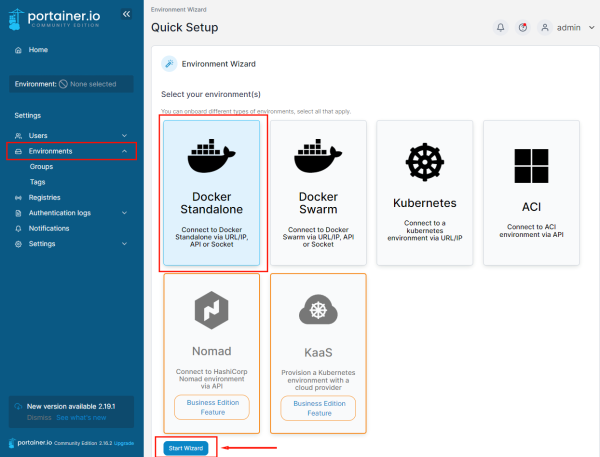 Navigate in the Portainer.io web interface to the Environments tab and select one of the available options, for example, Docker. Then click the button: