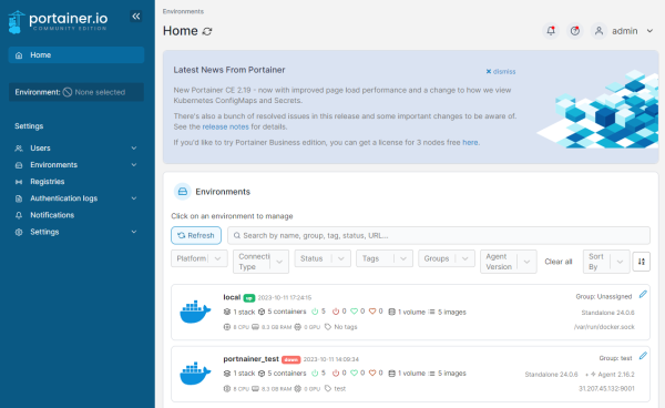 - Environments - displays added environments (clusters) where Portainer is running. Allows management of containers in different environments;