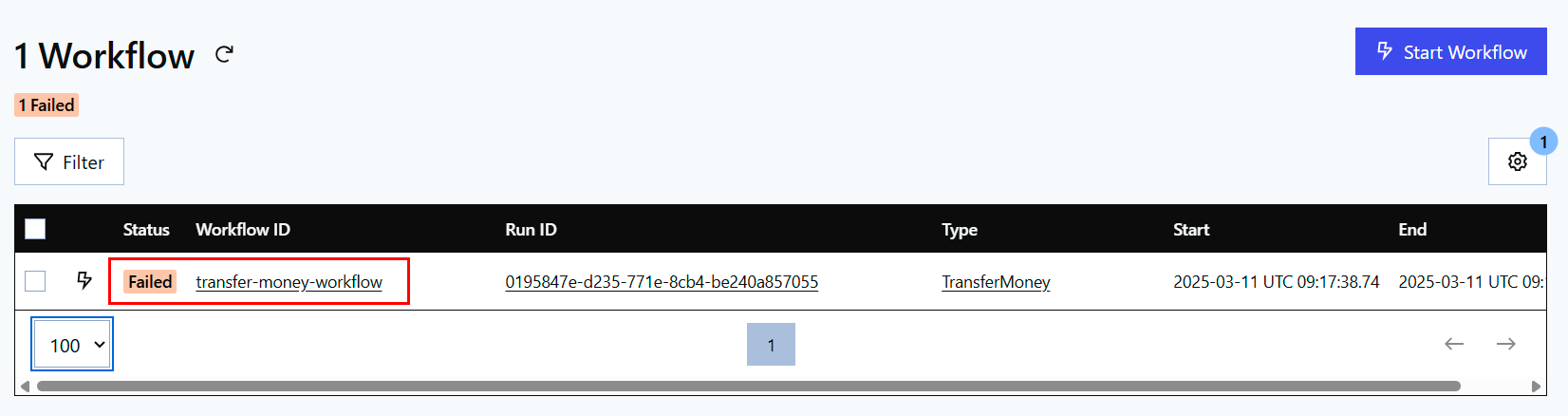 Start Workflowbutton in the top right corner for starting new processes;- Process table with columns Status, Workflow ID, Run ID, Type, Start, End.