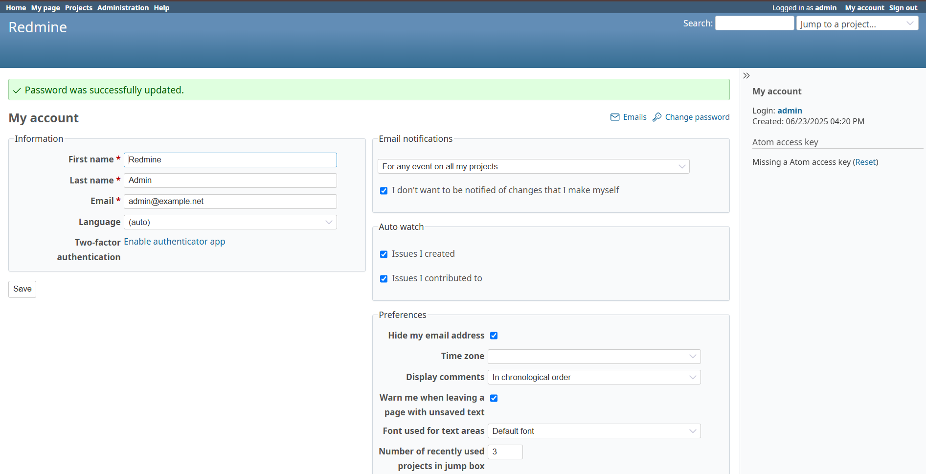 Detailed information about configuring and using Redmine is available in the official documentation.