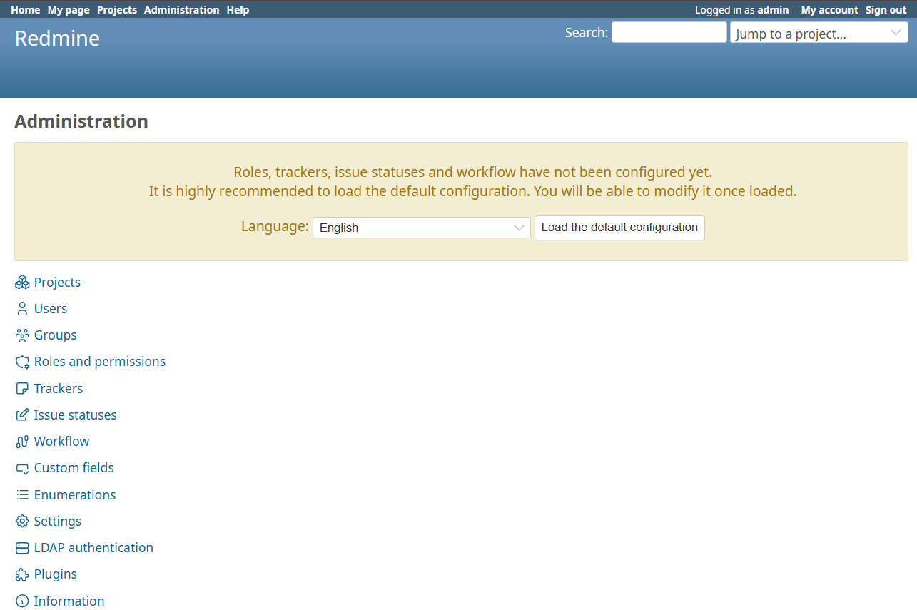 "Roles, trackers, issue statuses and workflow have not been configured yet. It is highly recommended to load the default configuration. You will be able to modify it once loaded."