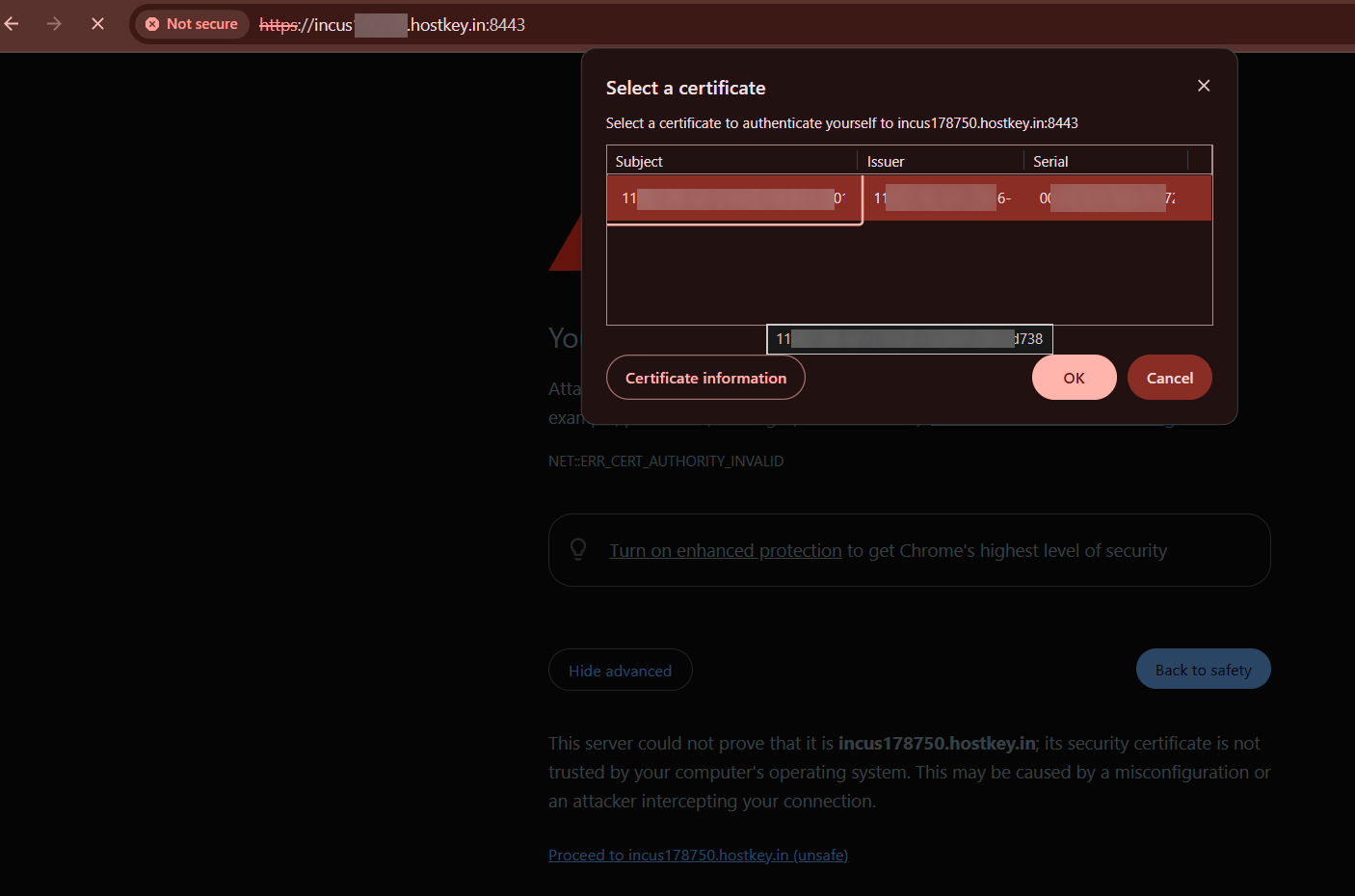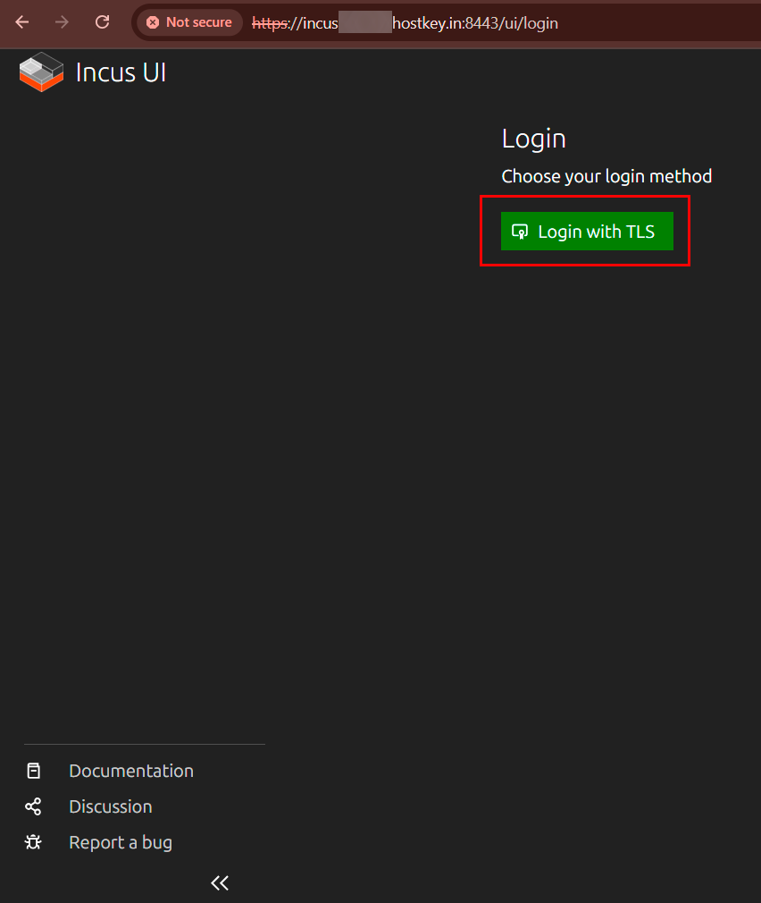When first accessing the Incus web interface, the browser will warn about an insecure connection due to the self-signed certificate. You must accept the certificate to continue: