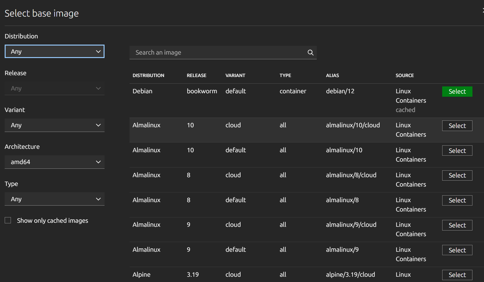 An instance creation form with several configuration sections will open. To select a base image, click the Browse images button. An image selection window with filters by distribution, release, variant, architecture, and type will open: