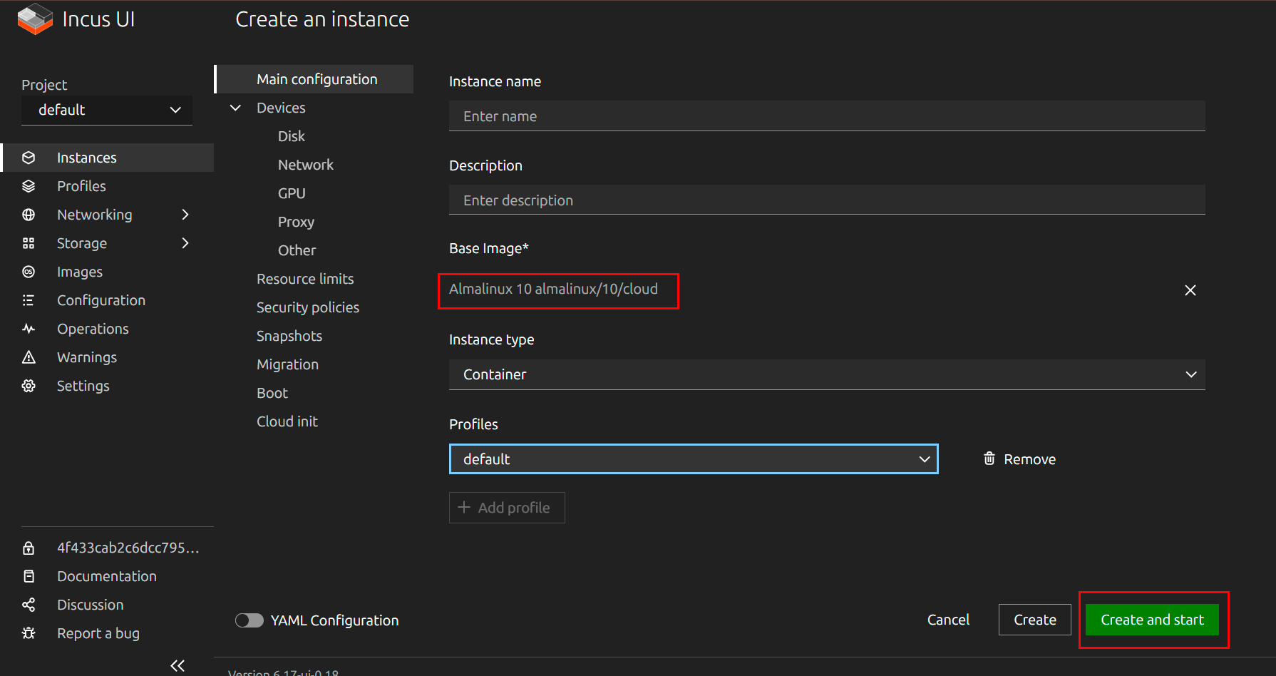 To start the container immediately after creation, click Create and start. To create without starting, use the Create button.