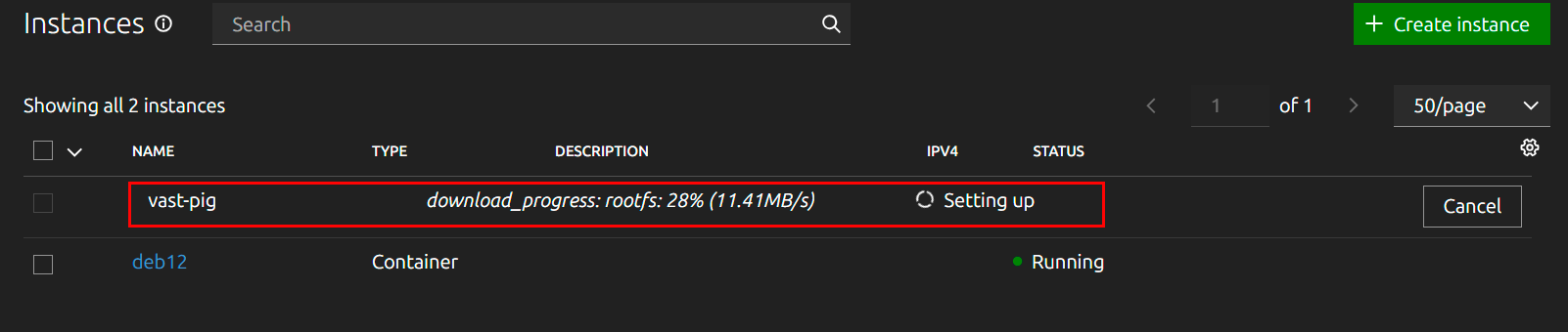To create a new container, click the Create instance button in the upper right corner of the interface: