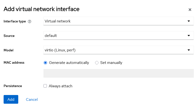 defaultvirbr0, if VM internet access without direct external visibility is sufficient. - Click