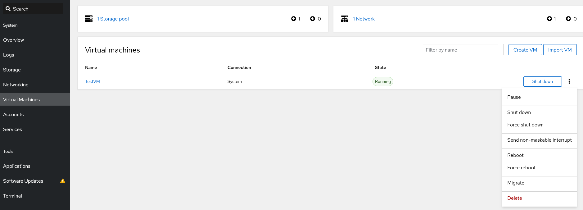 TestVMis in the Running state. - Open the VM console in Cockpit and log in with the user created during installation.