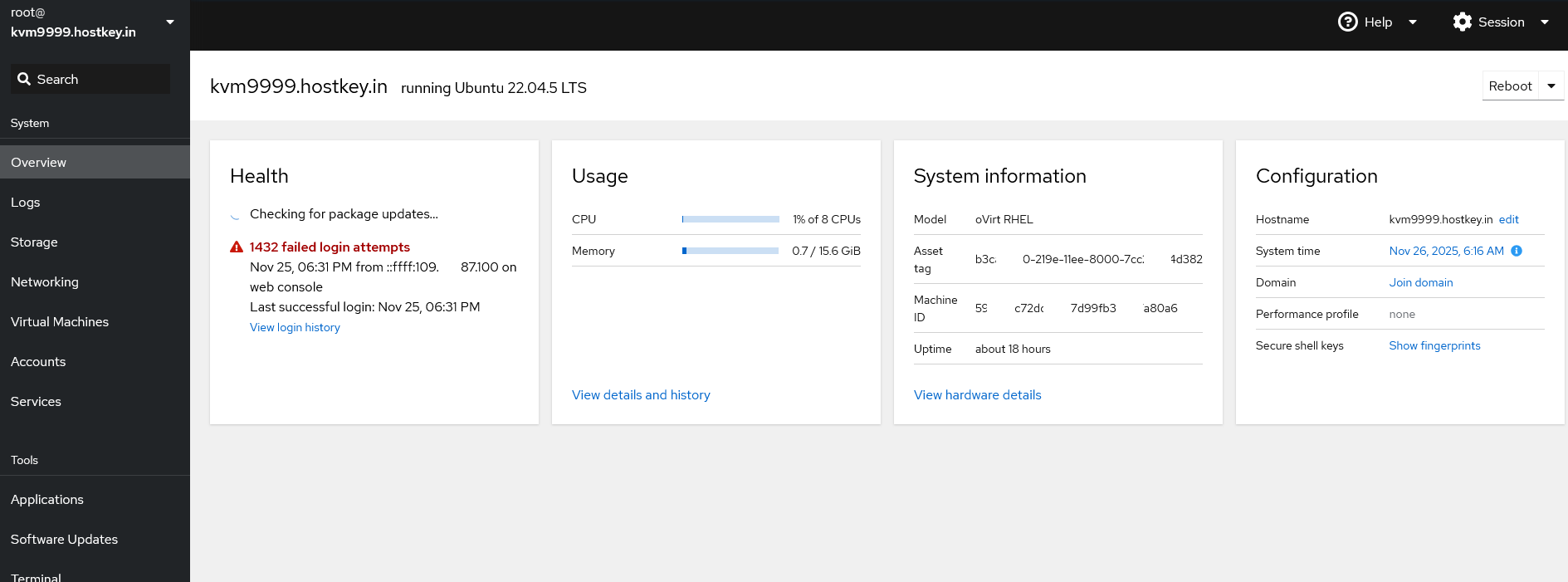 KVM with web management via Cockpit is a ready-made hypervisor based on QEMU/KVM with a pre-installed Cockpit web panel and the cockpit-machines module for managing virtual machines. The solution is designed for rapid deployment of virtualization infrastructure with a convenient web interface, without the need to use separate GUI clients or complex CLI commands.