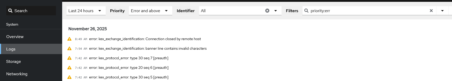 - Allows filtering logs by date, severity (Errors, Warnings, Notice) and services.